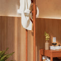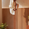 Sostenido por dos varillas de madera que confluyen en una base circular robusta, Cefiro promete no solo estabilidad y durabilidad, sino también un toque de calidez natural a tu espacio. Las varillas, destacadas por su acabado suave y líneas puras, elevan el diseño general, aportando ligereza y un aire contemporáneo. Los 8 ganchos que sobresalen diagonalmente, junto con los 2 ganchos verticales en la parte superior, están meticulosamente dispuestos para maximizar el espacio de colgado sin comprometer la forma ni la accesibilidad de las prendas.